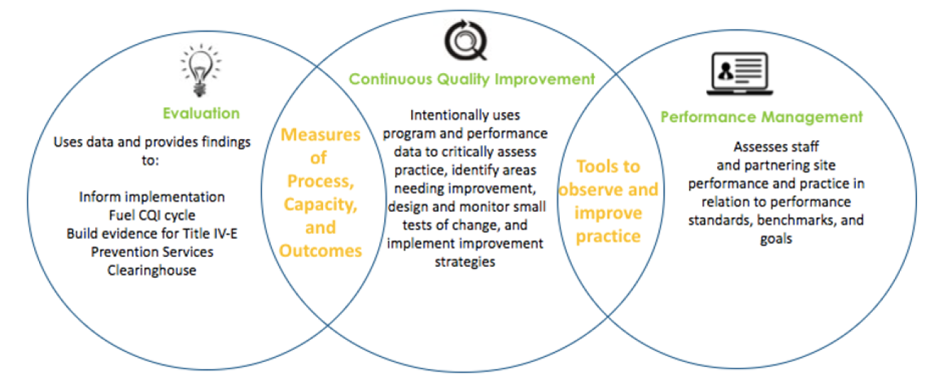 As shown in figure 7, OhioKAN CQI is closely aligned with the program’s evaluation activities and performance management framework. The findings from evaluation activities not only inform course corrections and build the evidence base for OhioKAN, but also fuel the CQI cycle. Similarly, CQI and performance management both assess staff and partnering site practice skills and use the same tools to observe and improve practice. While related to CQI, evaluation and performance management each represent distinct frameworks, whose relationships with CQI are further explained below.
