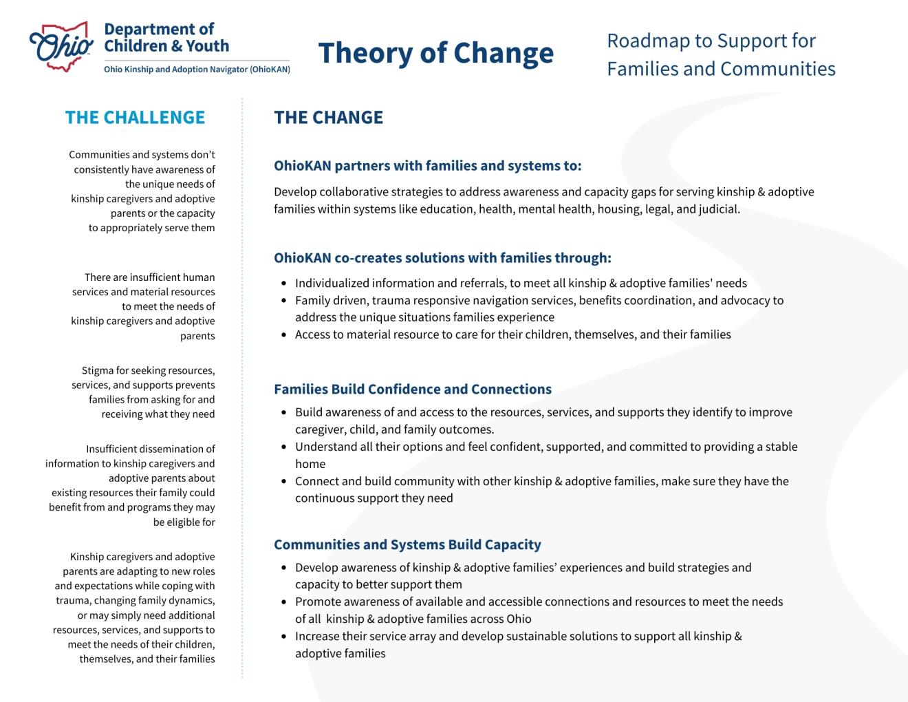 Figure 1. The first page of the OhioKAN theory of change documents the challenge that Kinship and Adoptive families face and the change that OhioKAN wishes to see in support of families and communities.